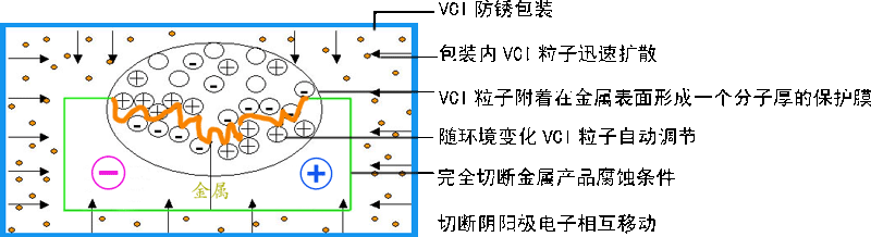 VCI是英文(Volatile Corrosion Inhibitor)的縮寫,它是一種具有揮發(fā)性的腐蝕抑制劑,簡稱為氣化性防銹產(chǎn)品。當(dāng)用氣化性防銹產(chǎn)品包裝好被包裝物以后,防銹產(chǎn)品的防銹粒子氣化成氣體,吸附在金屬表面形成保護膜,切斷金屬離子與水、氧氣接觸的可能性,有效抑制了金屬腐蝕電化學(xué)反應(yīng)的發(fā)生,從而達(dá)到防銹效果。包裝后內(nèi)部的防銹粒子的氣化擴散量自動調(diào)節(jié),當(dāng)濕度或溫度增大時,防銹粒子的擴散量也會加大, 反之,防銹粒子的擴散量會減小,從而來自動調(diào)節(jié)包裝物內(nèi)部的氣體濃度,讓包裝物始終處于一種最穩(wěn)定的防銹狀態(tài)。